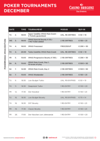 Take a little time for a short introduction and look forward to exciting poker evenings at Casino Bregenz. In the poker player's guide folder you will learn more about: