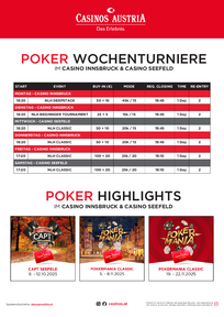 During the poker events at Casino Innsbruck and Casino Seefeld the weekly tournaments and daily cash game offers are suspended.