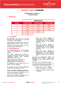 Zurück zur Übersicht Black Jack Turnier 19.03.2026 19:00 Zum Kalender hinzufügen Casino Velden Am Corso 17, 9220 Velden Freue dich auf das Black Jack Turnier am 19. März 2026 um 19:00 Uhr. Buy-in 100 Euro + 20 Euro1 Re-entry 50 Euro + 10 Euro