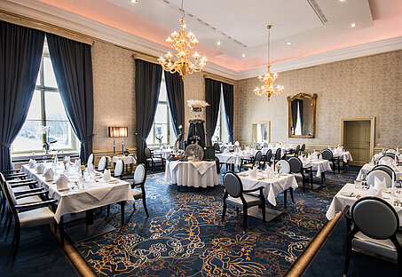 Großer Restaurant Raum im barocken Stil mit dunkelblauen Akzenten, schön gedeckte Tische